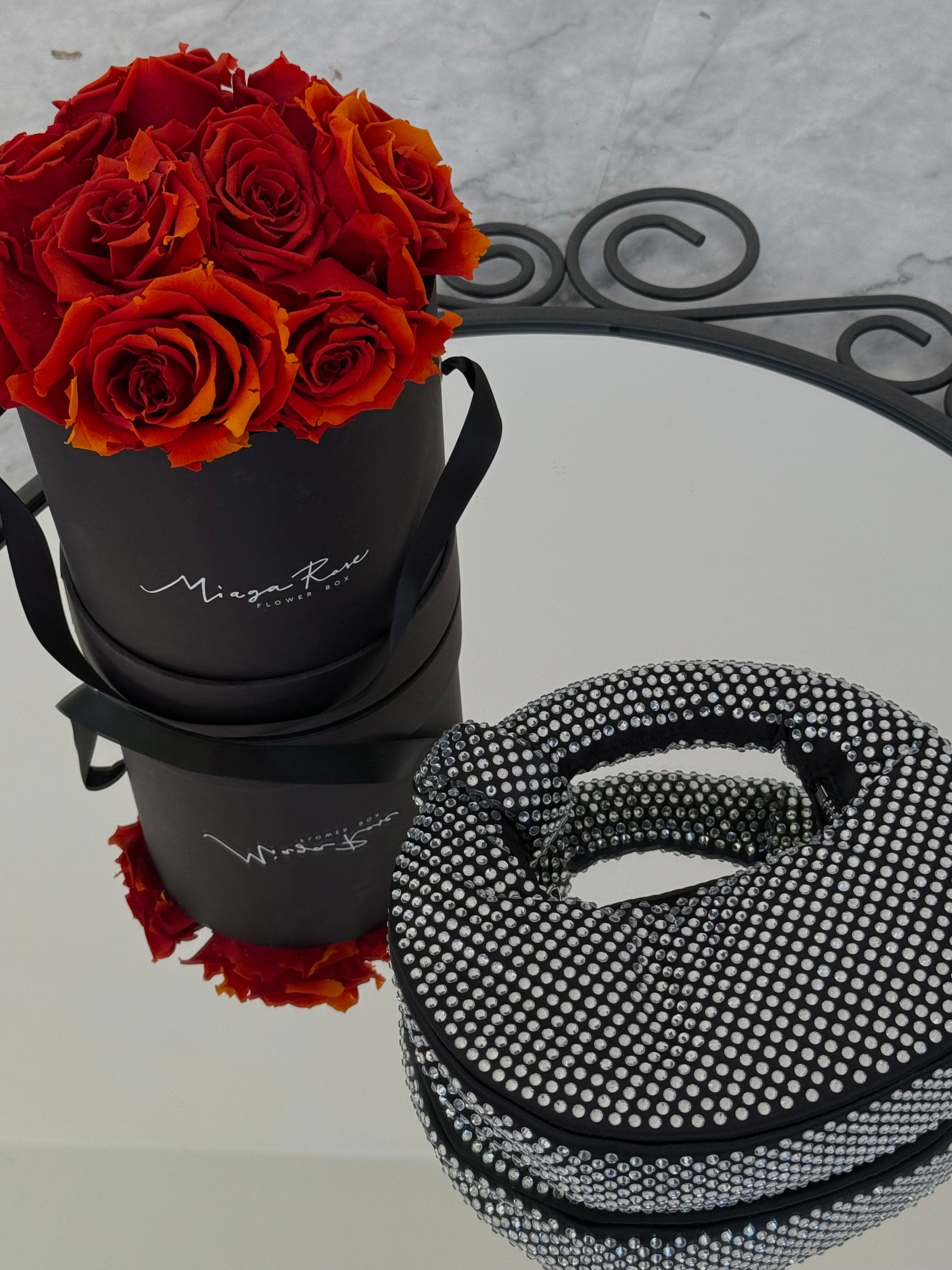 Mini bag a forma rotonda, interamente rivestita di strass luminosi applicati su base nera. Manico corto con nodo decorativo, chiusura superiore con zip. Struttura morbida ma compatta, pensata per essere portata a mano o al polso.