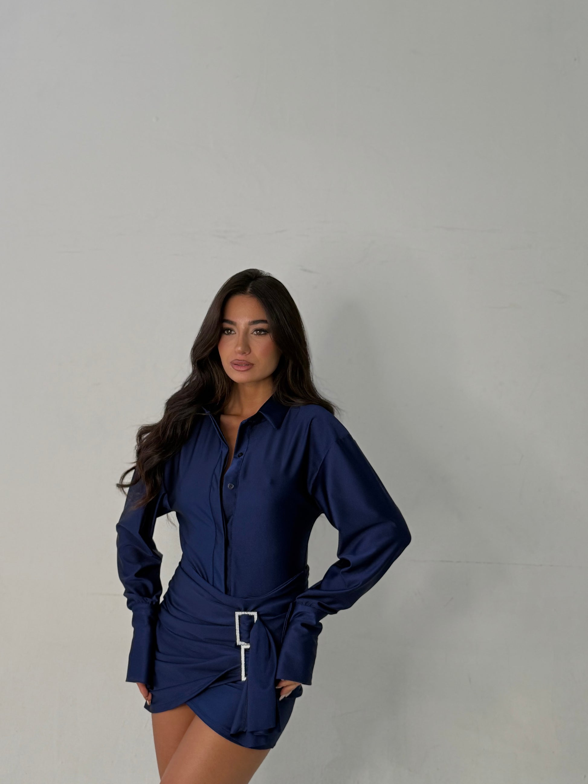Coordinato due pezzi blu con gonna e body, dettaglio di strass. Elastico