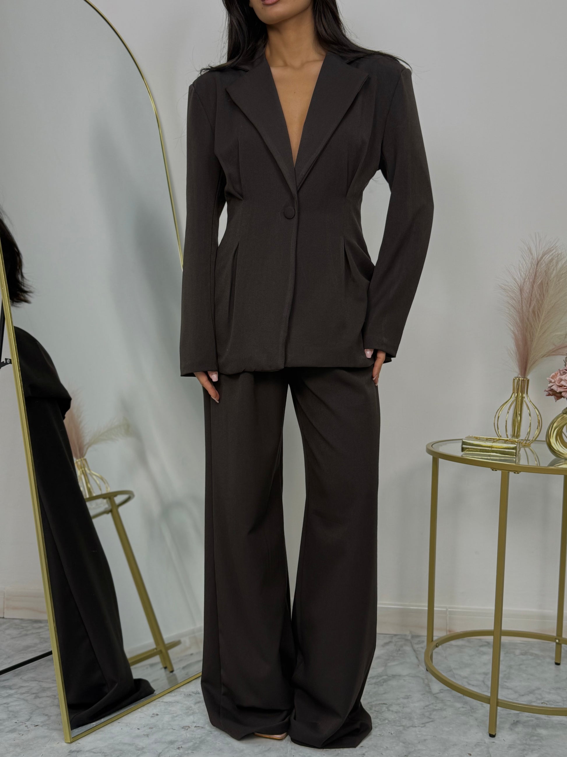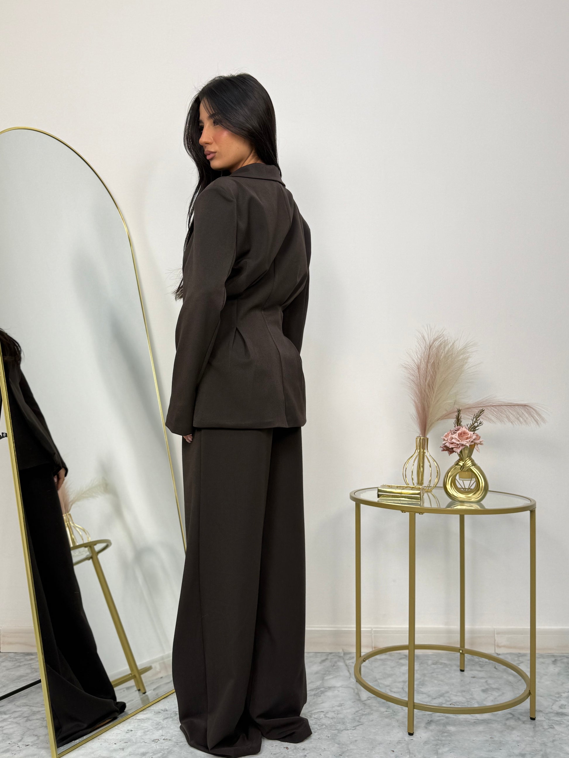 Coordinato due pezzi con giacca avvitata e pantalone palazzo marrone, elastico