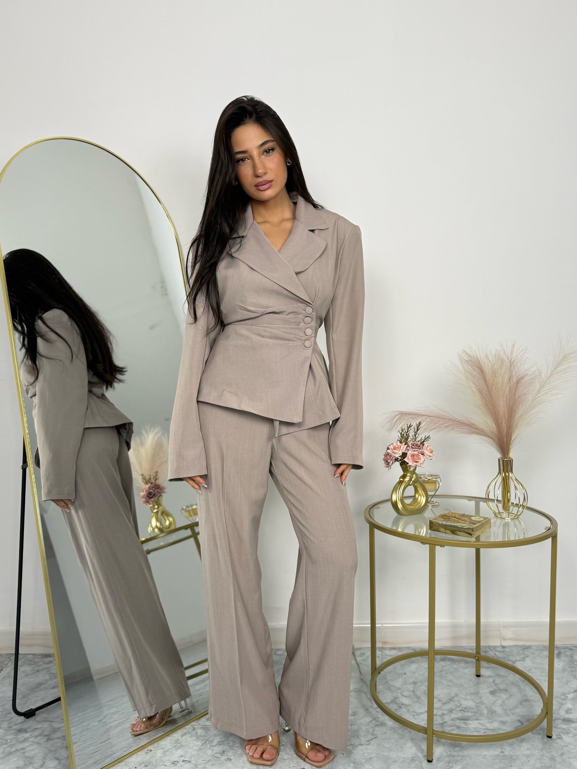 Coordinato due pezzi con giacca e dettagli in bottoni, pantalone a palazzo. Elastico
