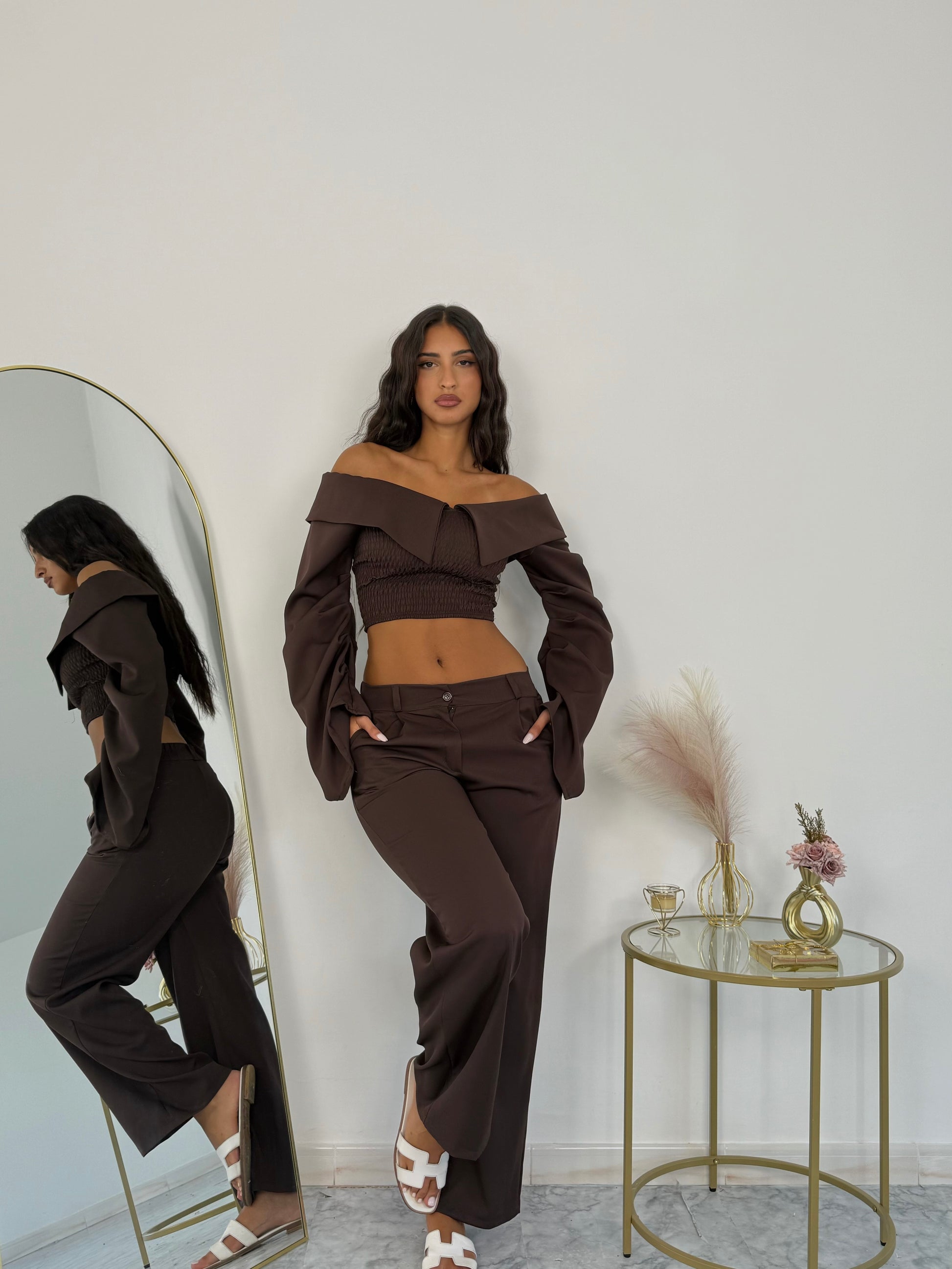 - crop top con scollo a barca che lascia le spalle scoperte, corpino elasticizzato e maniche lunghe leggermente svasate.