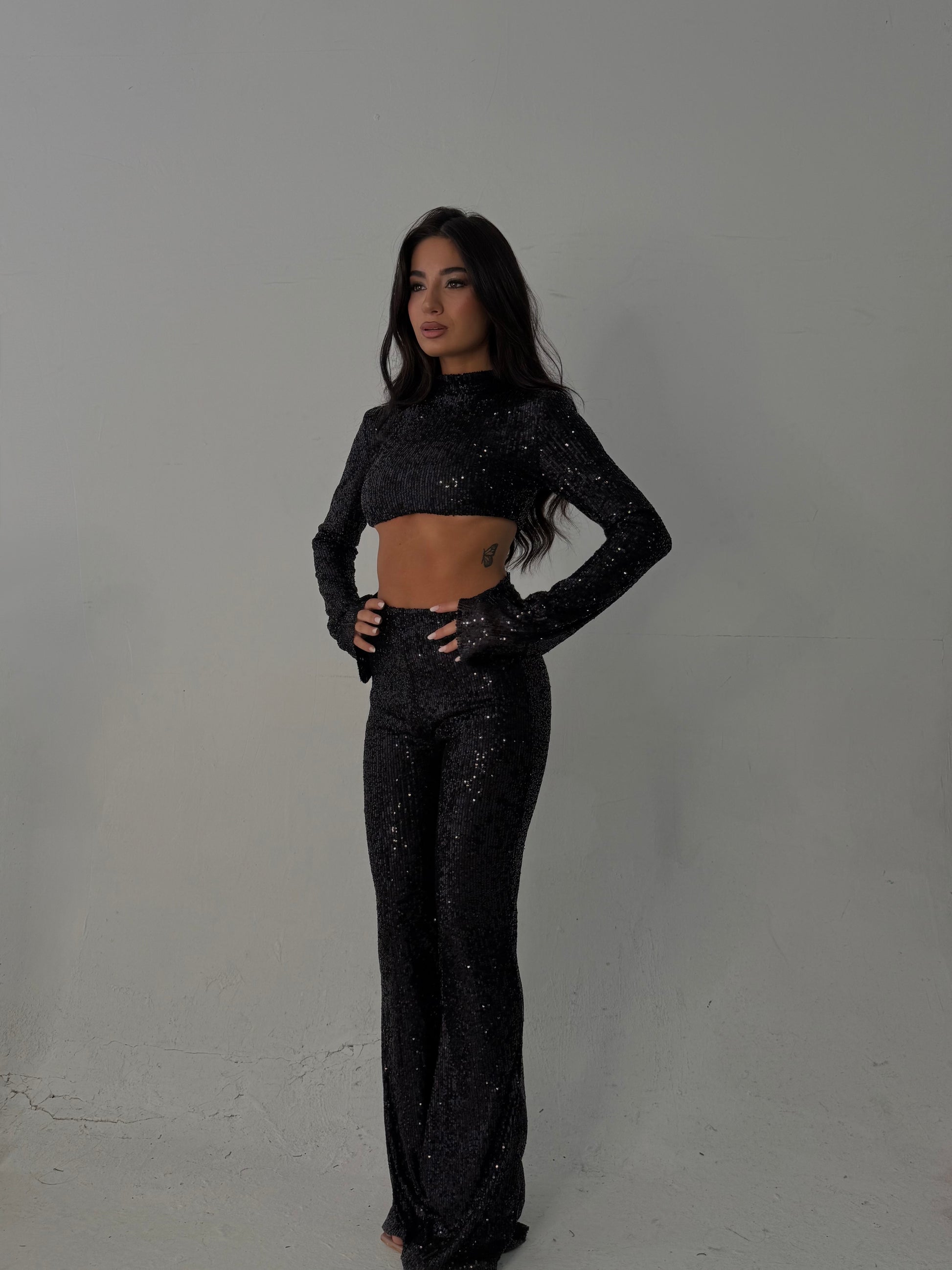 Coordinato due pezzi con paillettes, pantalone e top. Elastico