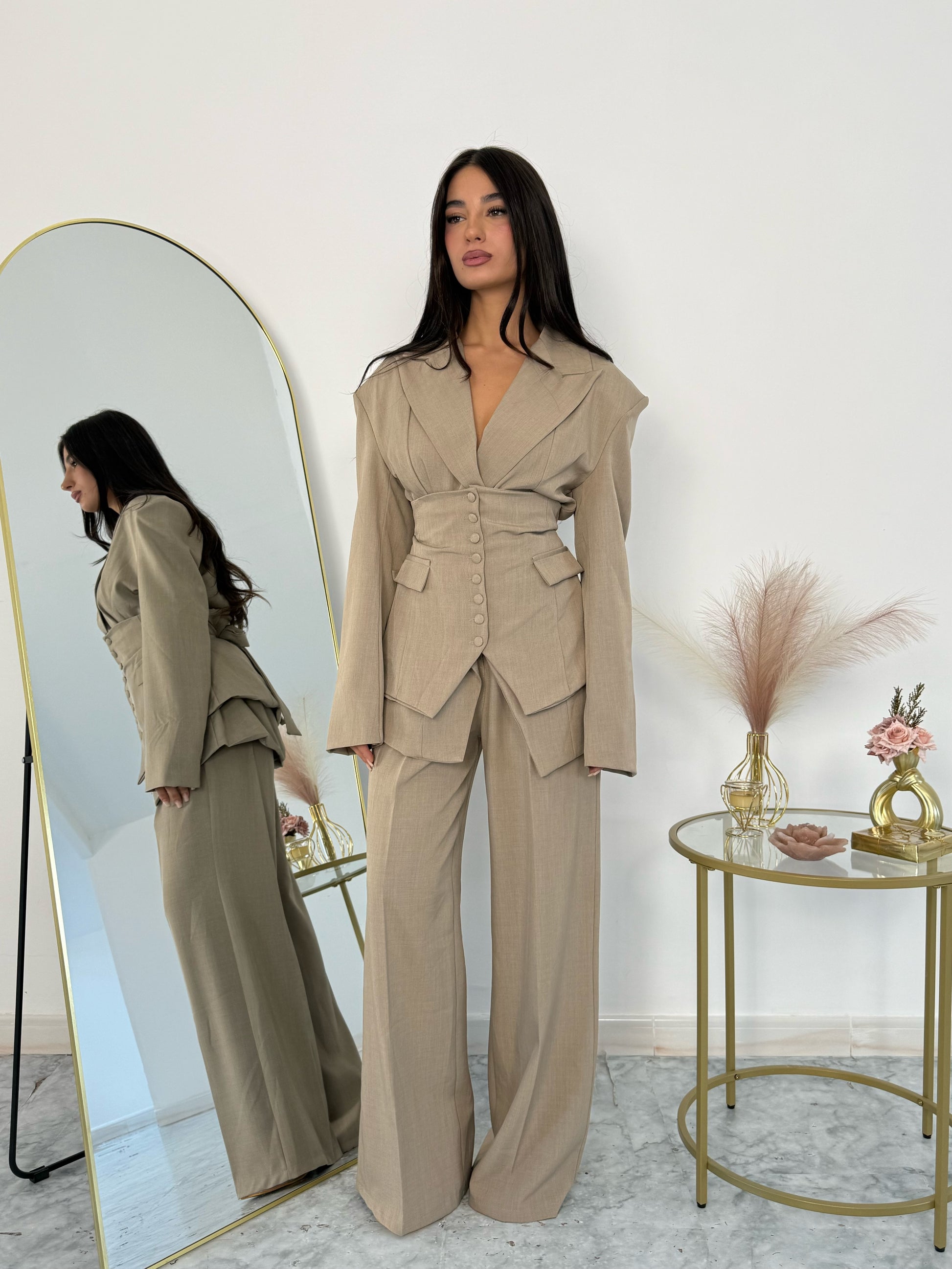 Coordinato tre pezzi con giacca, panciotto e pantalone. Il panciotto è staccato, regolabile