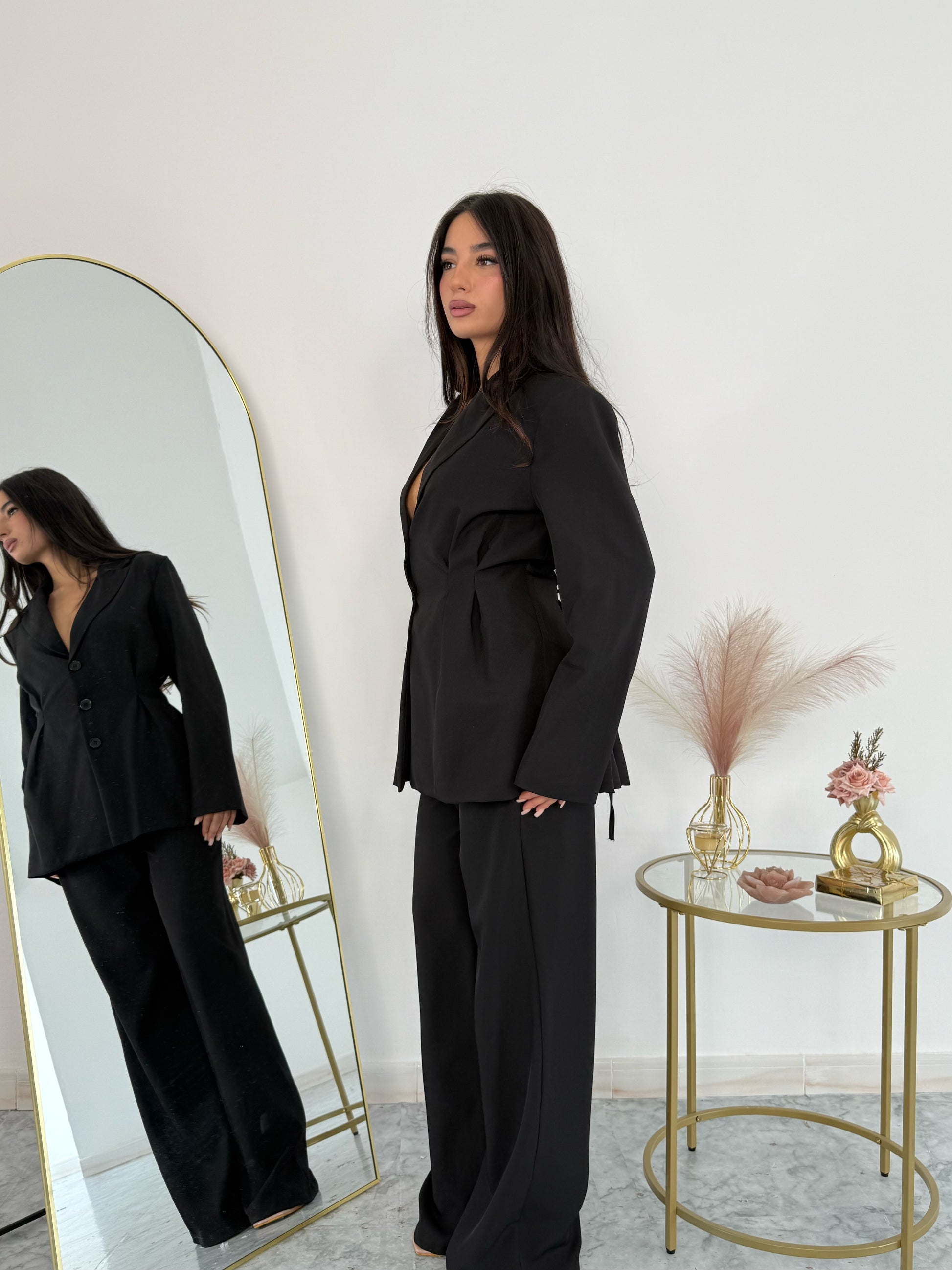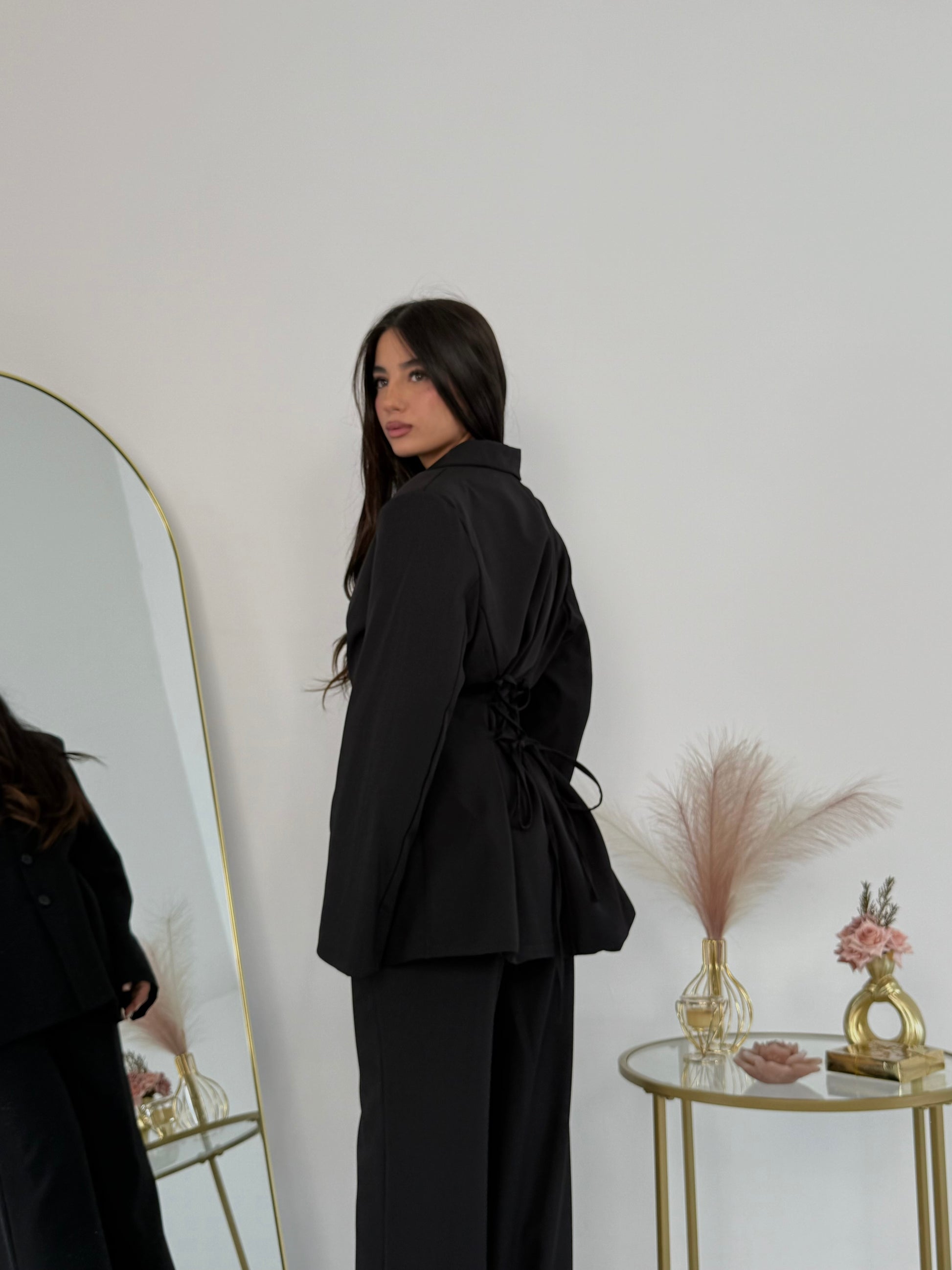 Coordinato due pezzi con pantalone a palazzo e giacca con intrecci sul retro regolabile