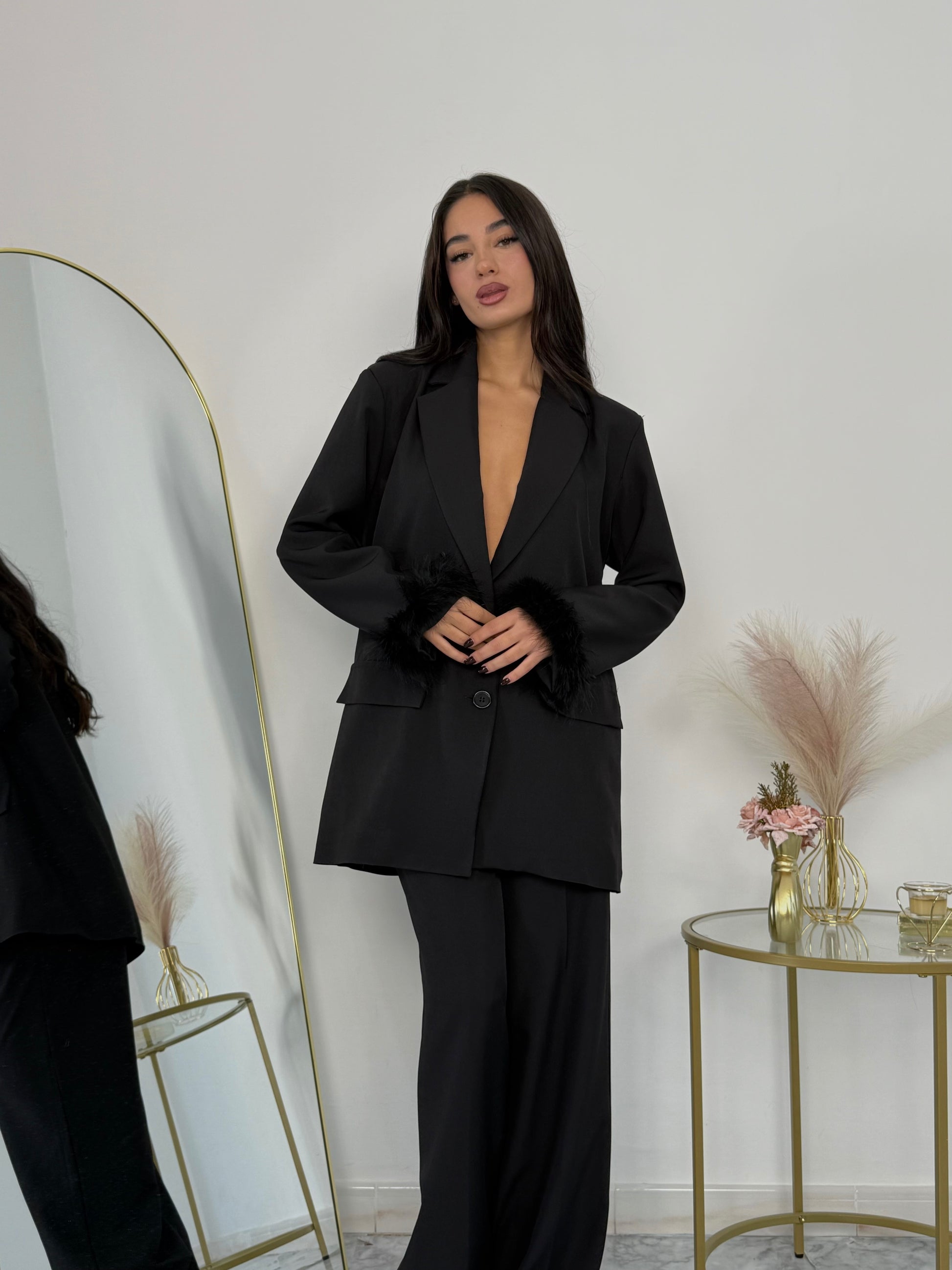 Coordinato due pezzi con giacca doppio petto e piume, pantalone a palazzo con elastico sul retro. Elastico