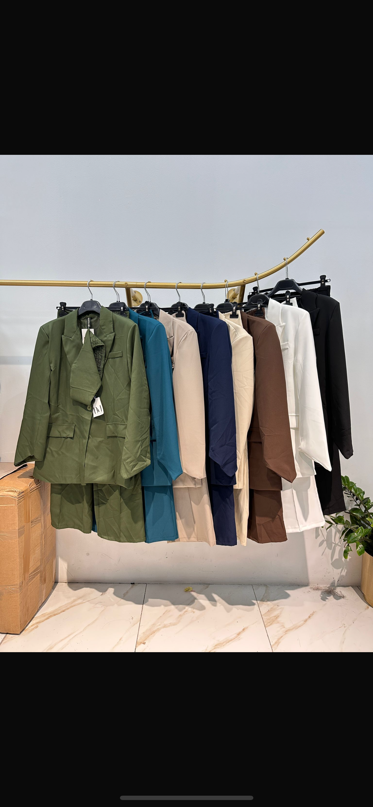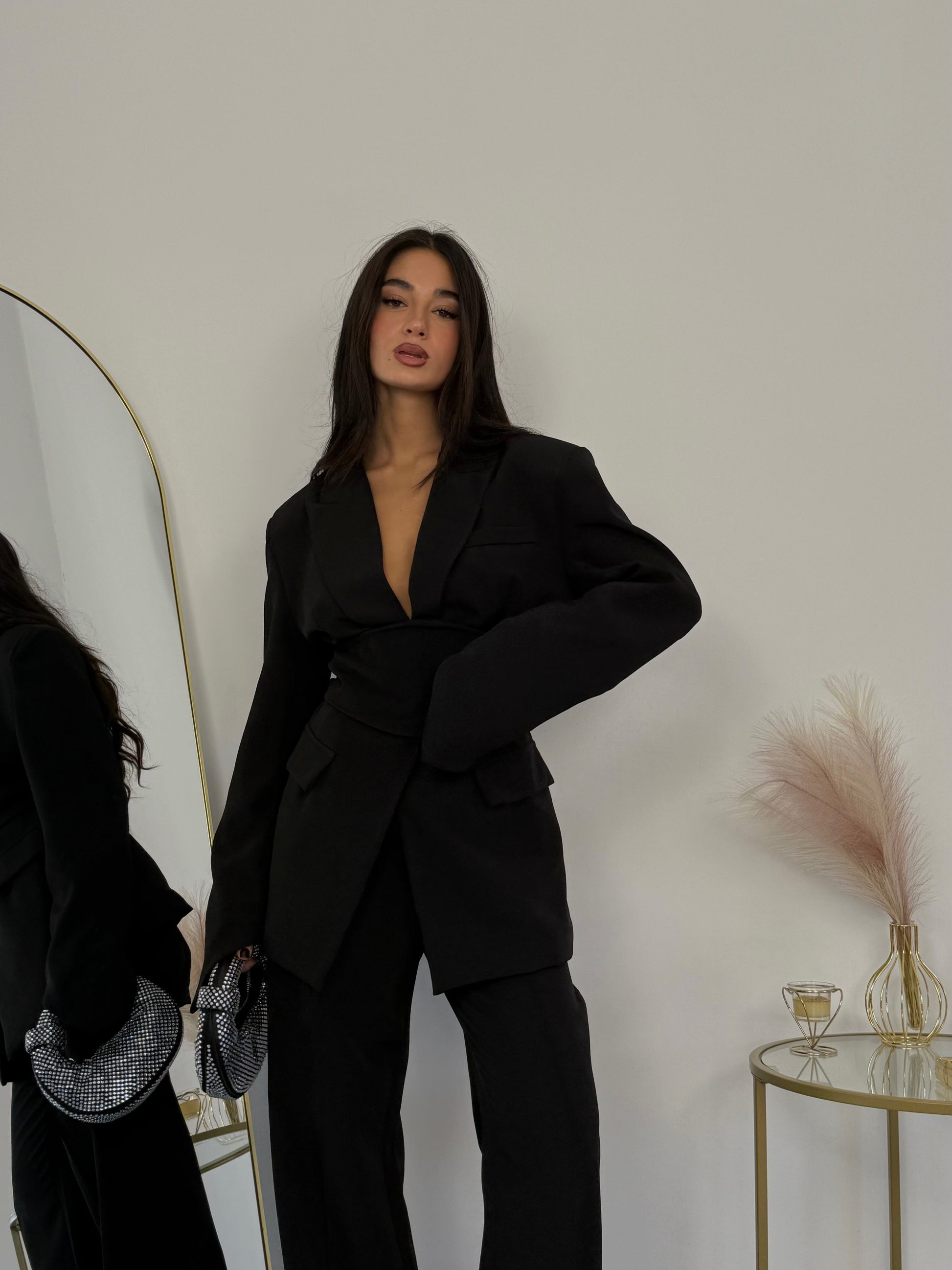 Coordinato due pezzi in tessuto fluido composto da blazer e pantalone. Il blazer presenta scollo a revers, chiusura a bottone e fascia in vita che sottolinea la silhouette e dona struttura al capo. I pantaloni hanno vita alta e gamba dritta con vestibilità morbida.