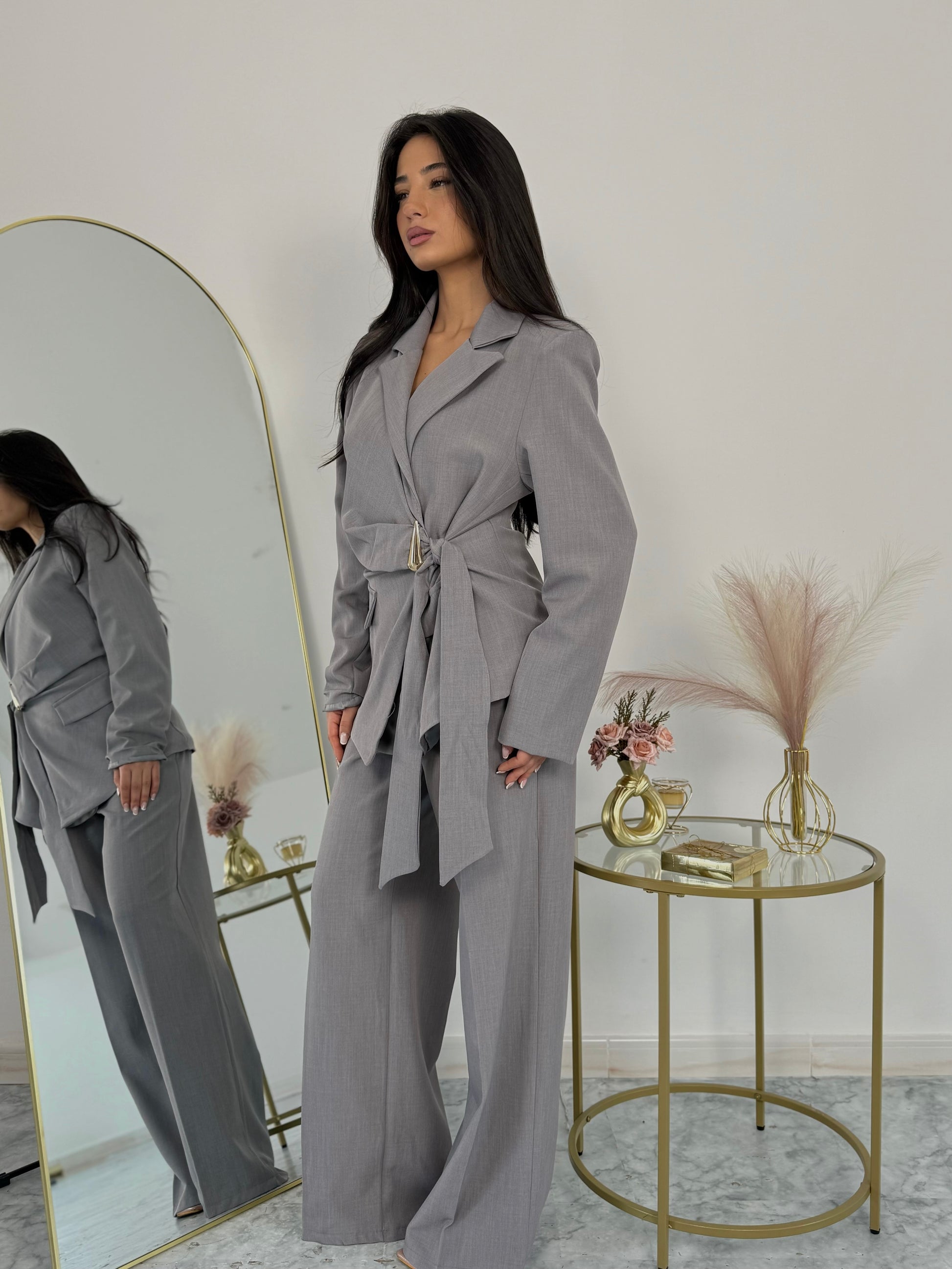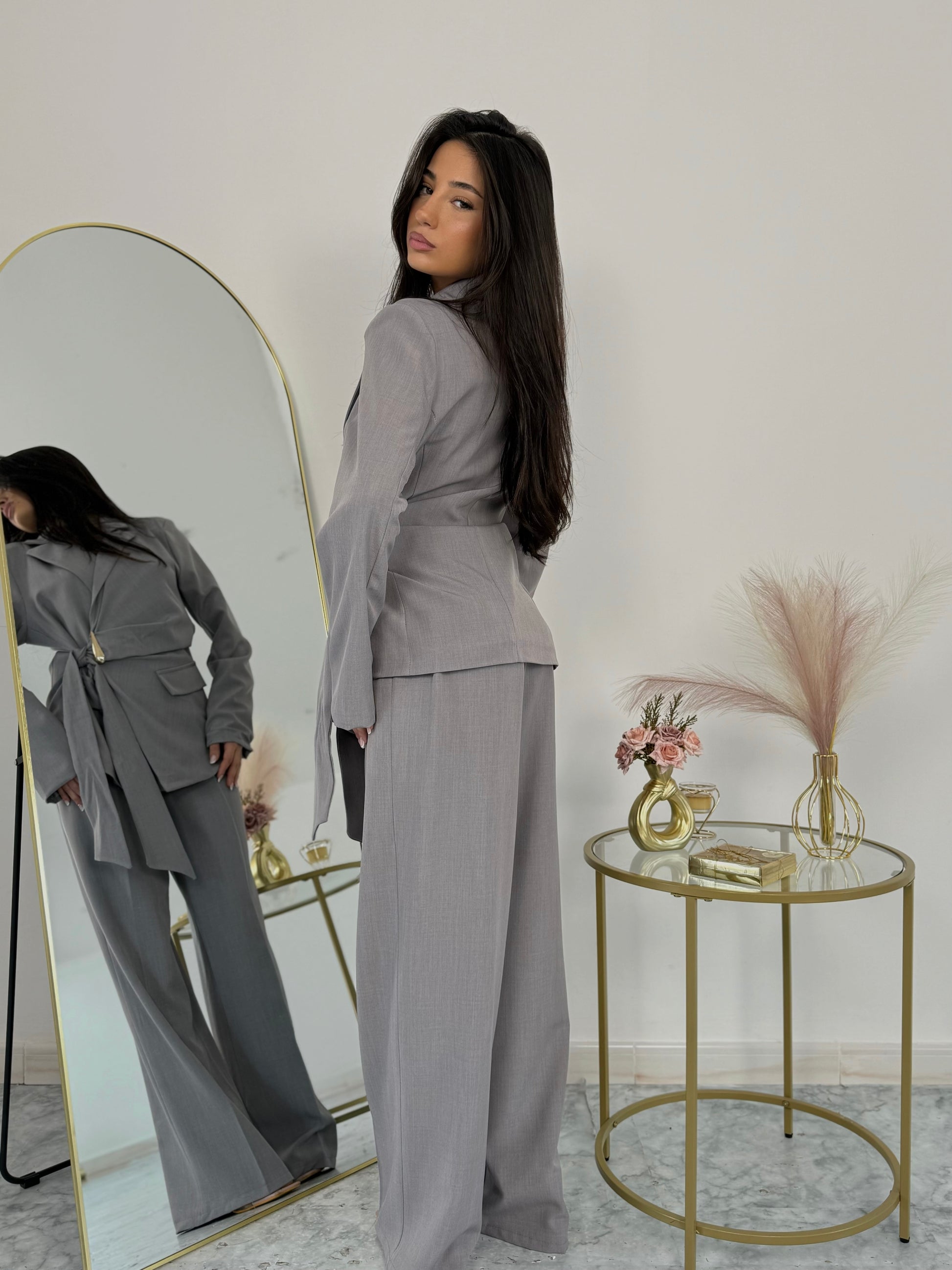 Coordinato grigio due pezzi con pantalone a palazzo e giacca incrocio con dettaglio gioiello. Elastico