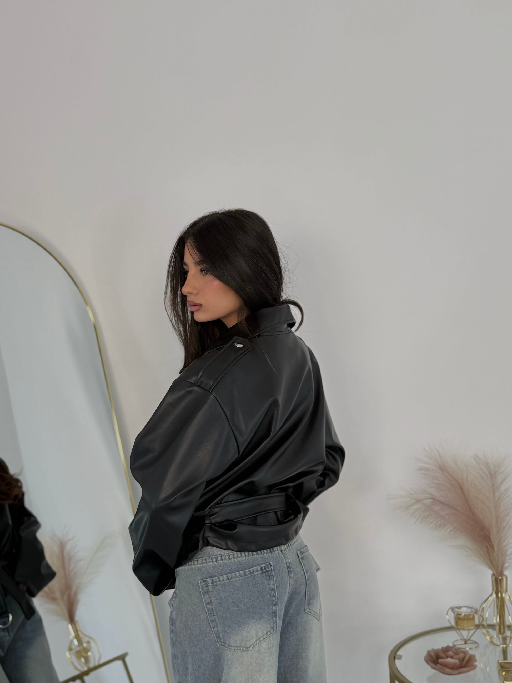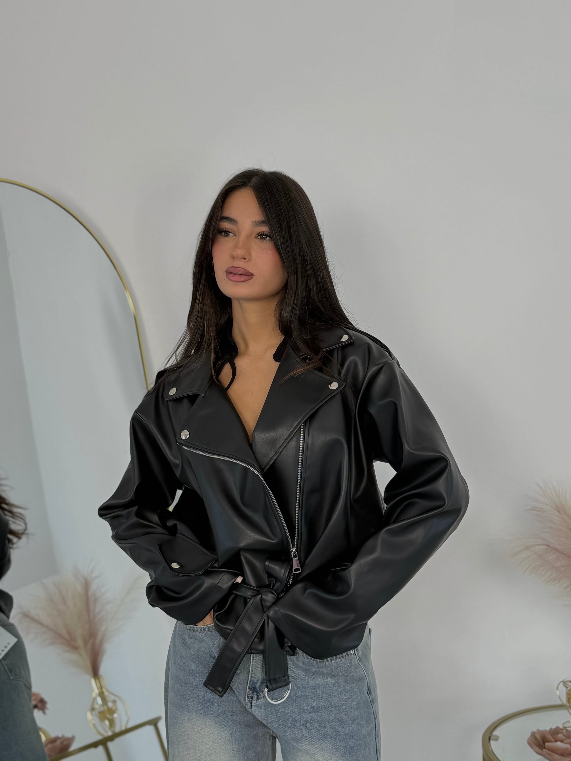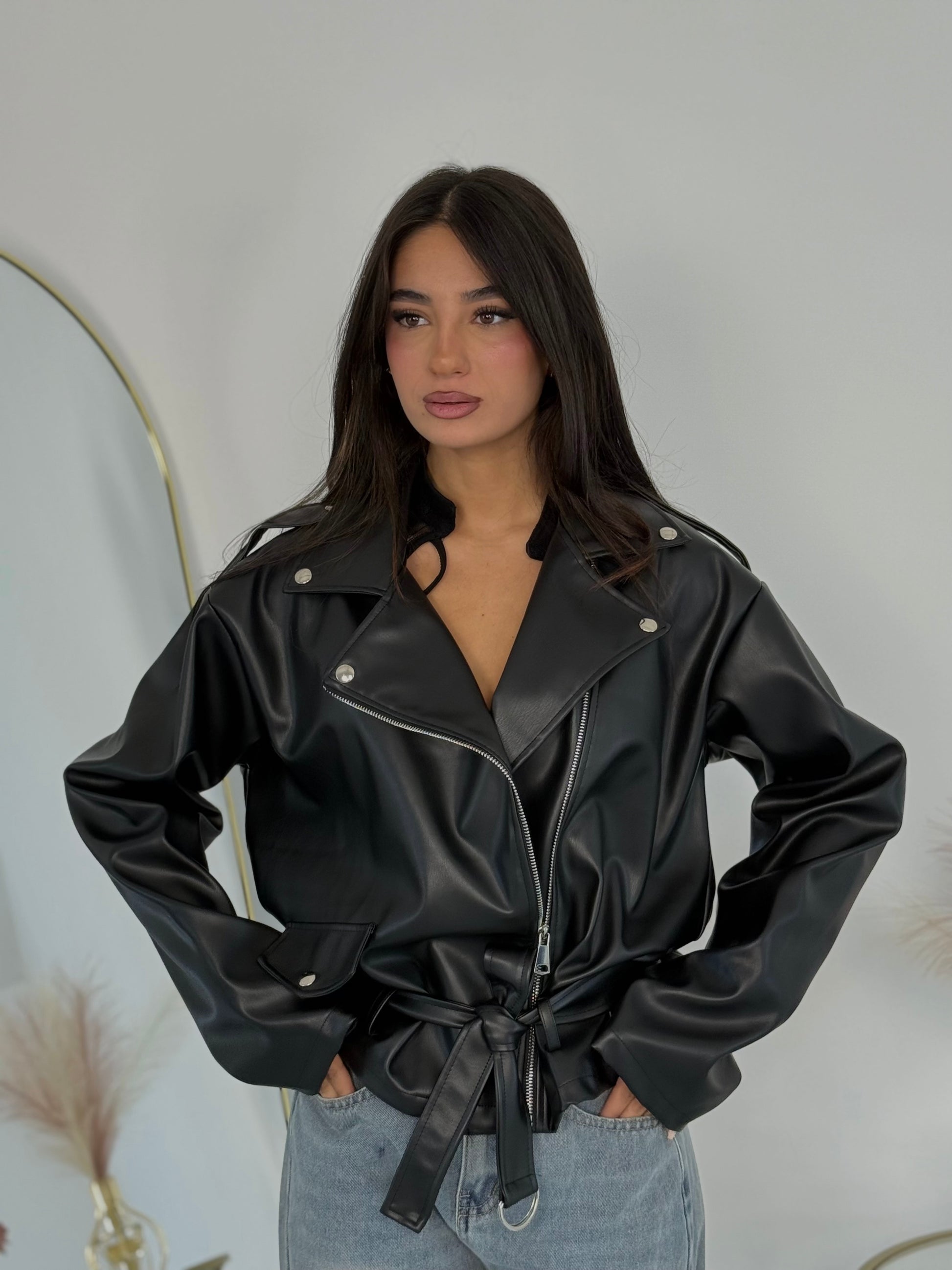 Giacca biker in ecopelle dal taglio morbido, con revers a lancia e zip laterale. Presenta cintura coordinata in vita che permette di regolare e valorizzare la silhouette. Dettagli di bottoni a pressione sulle spalle e tasche applicate frontali. Capo di media lunghezza, versatile e facile da abbinare.