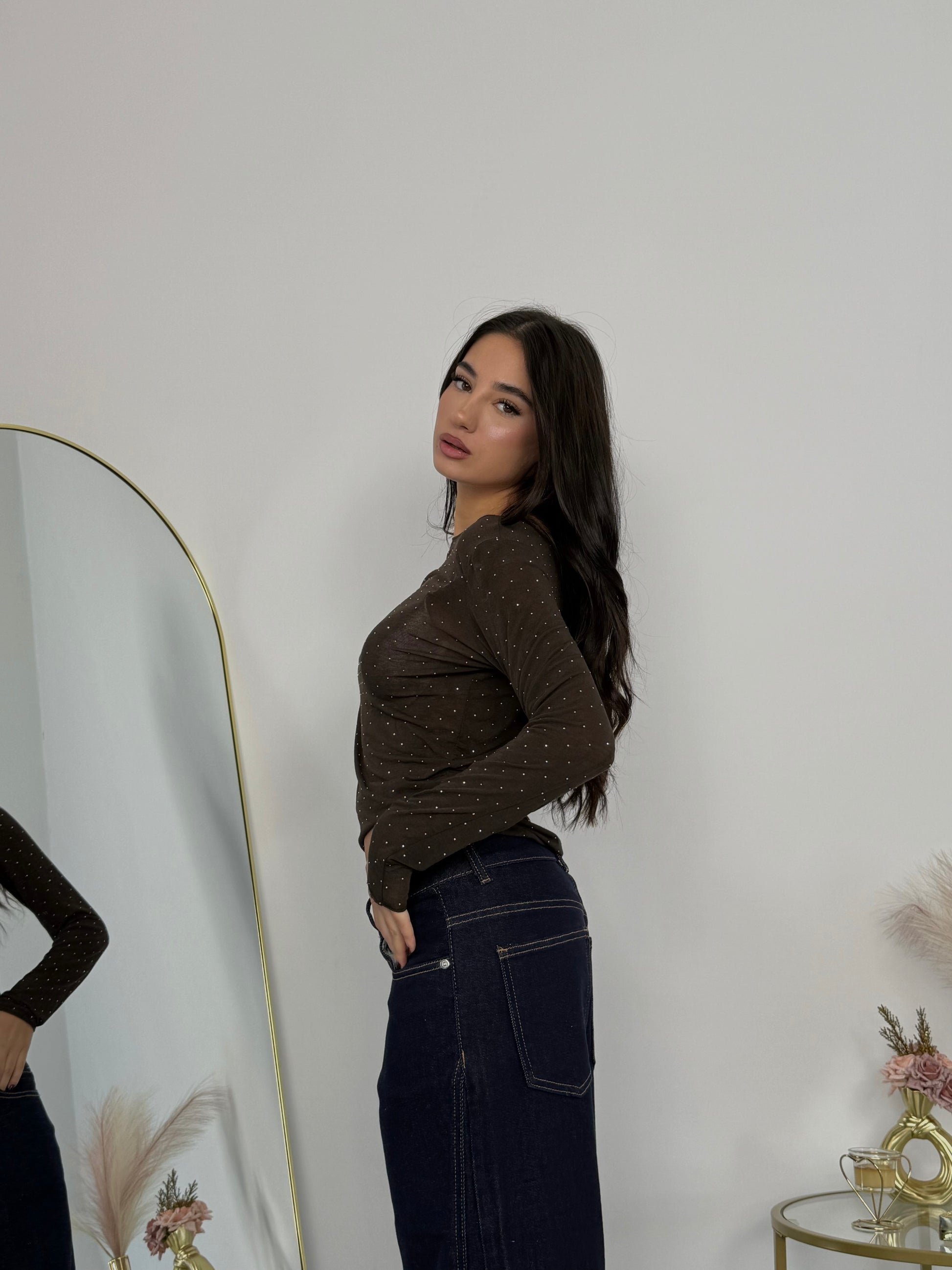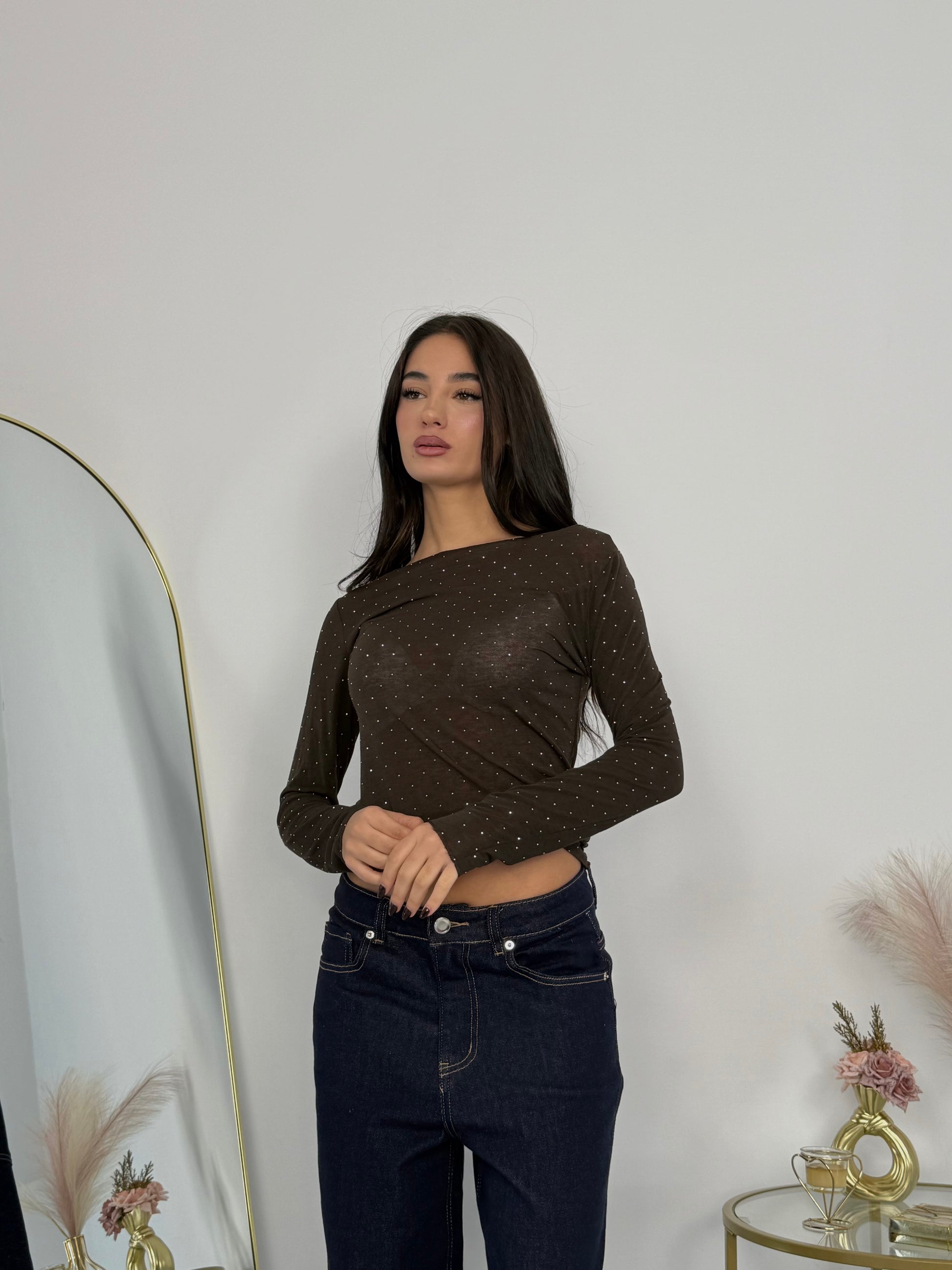 Maglia semitrasparente con brillantini, elastica