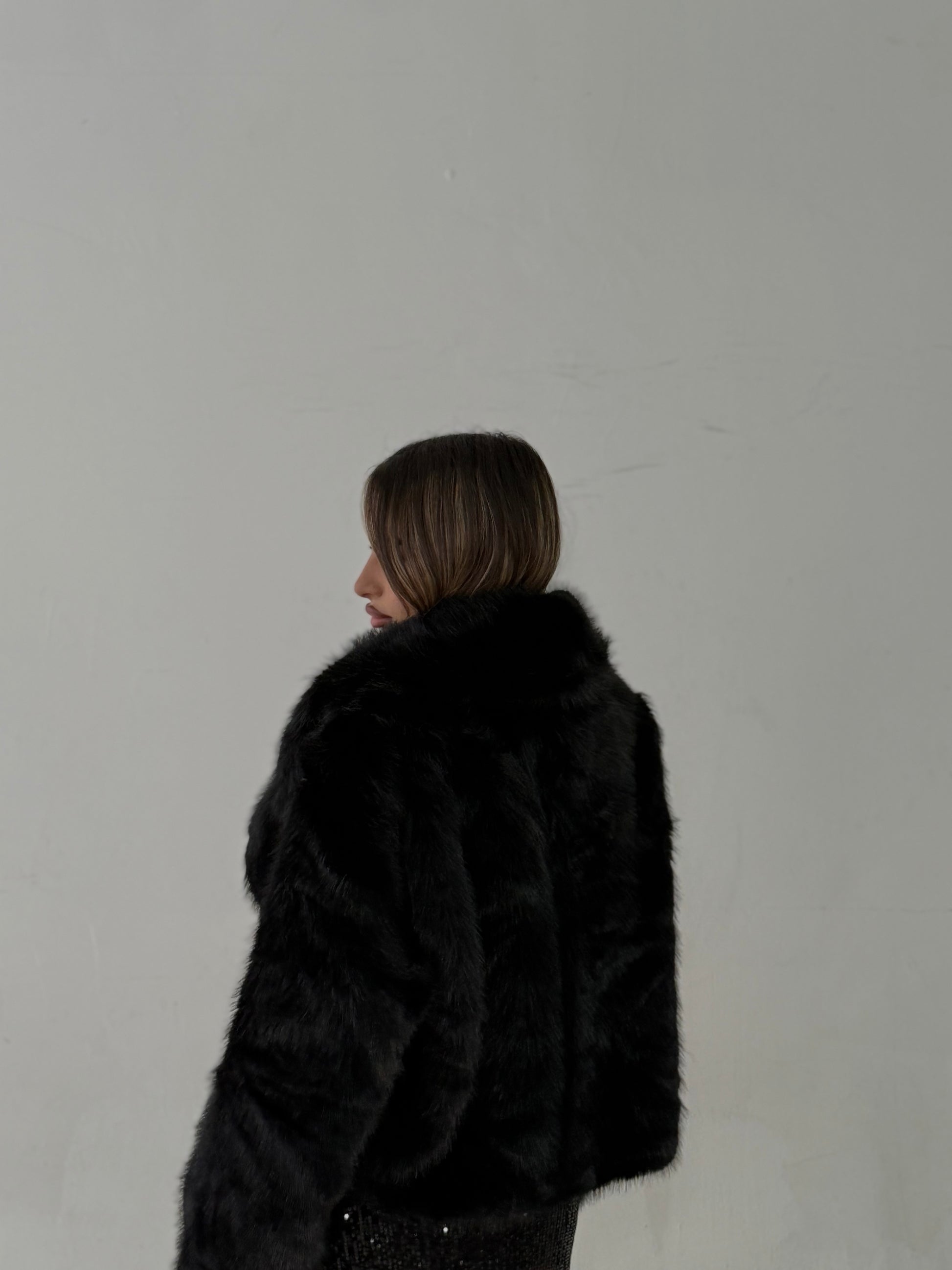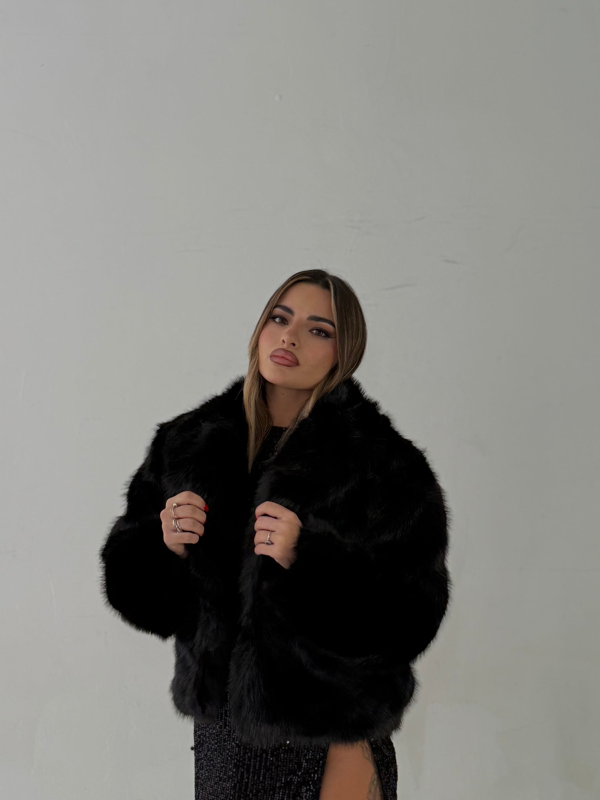 Pelliccia nera con chiusura a gancio, veste dalla xs alla L
