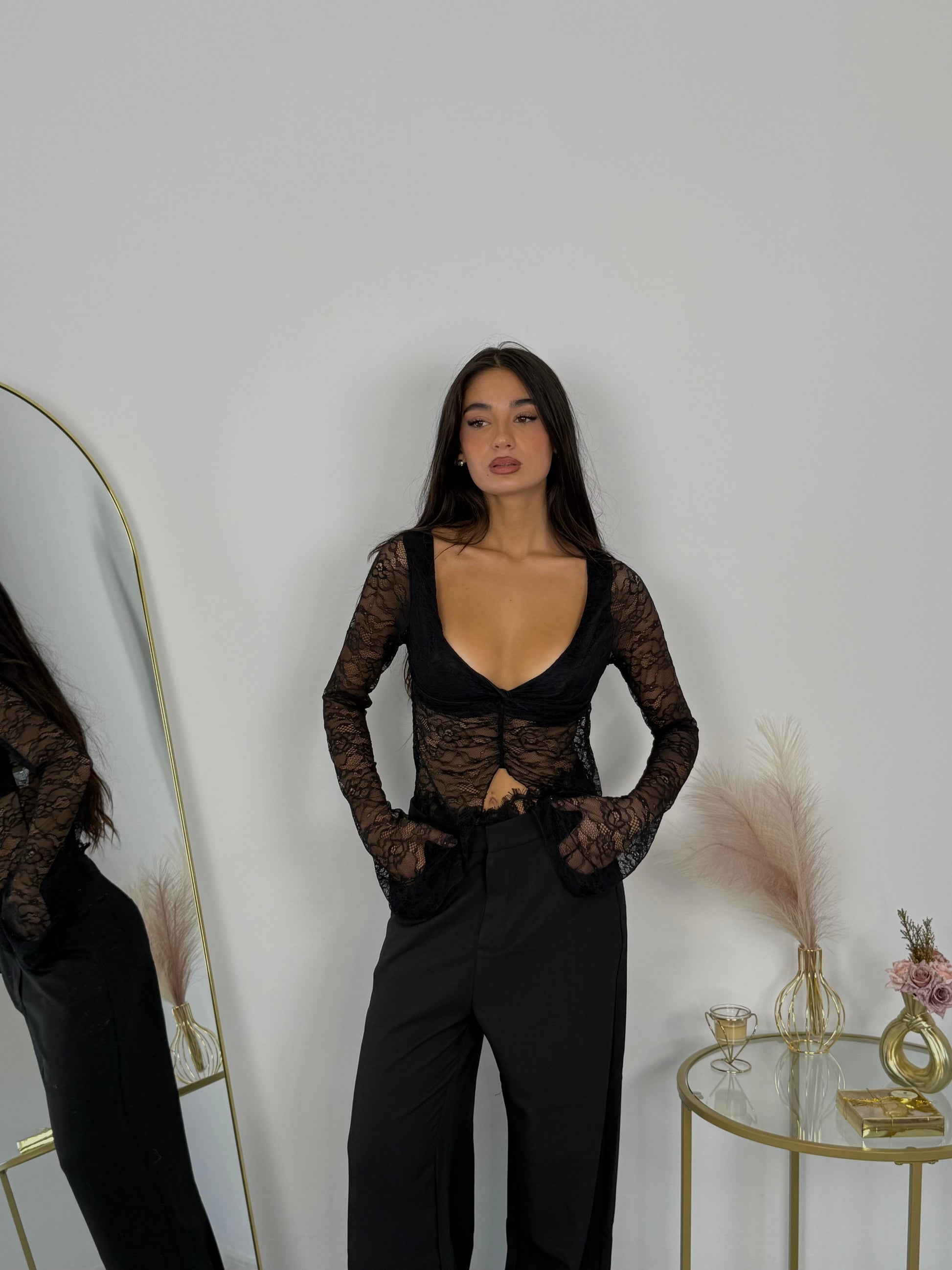 Top in pizzo nero trasparente con maniche lunghe. Modello corto con scollo profondo. Le maniche terminano con fondo leggermente svasato in pizzo.