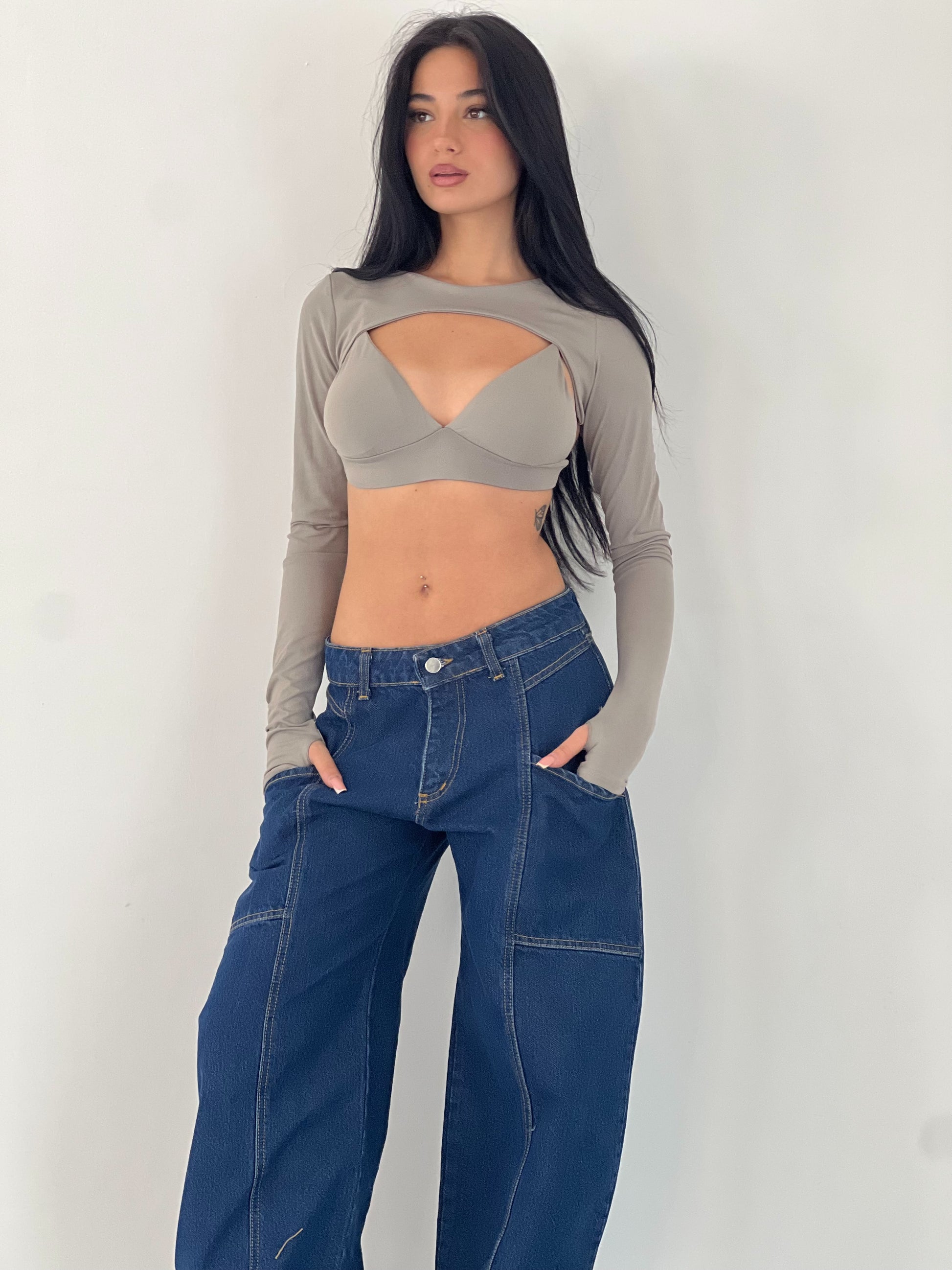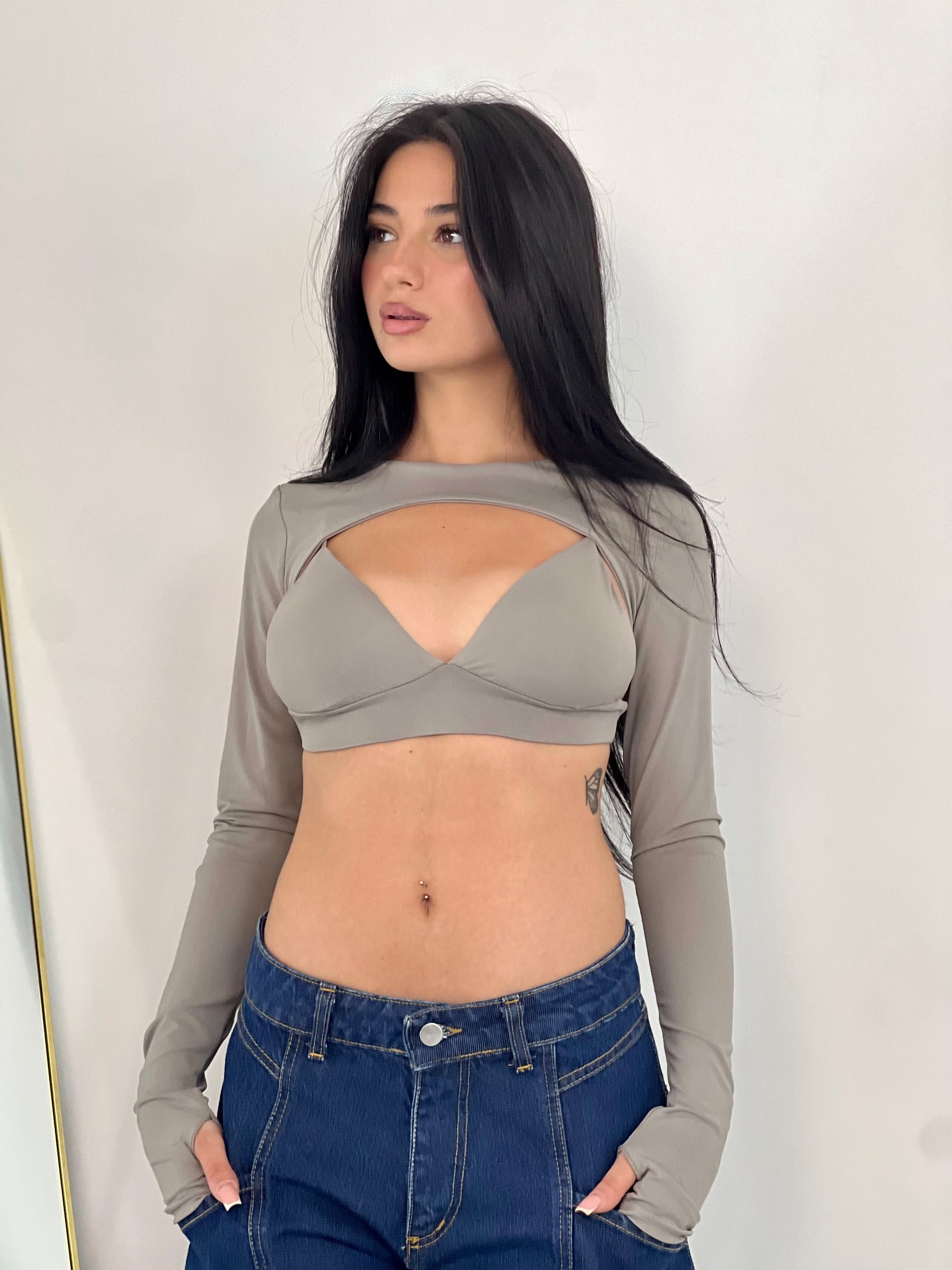 Top due pezzi con coprispalle e bralette tortora, elastico