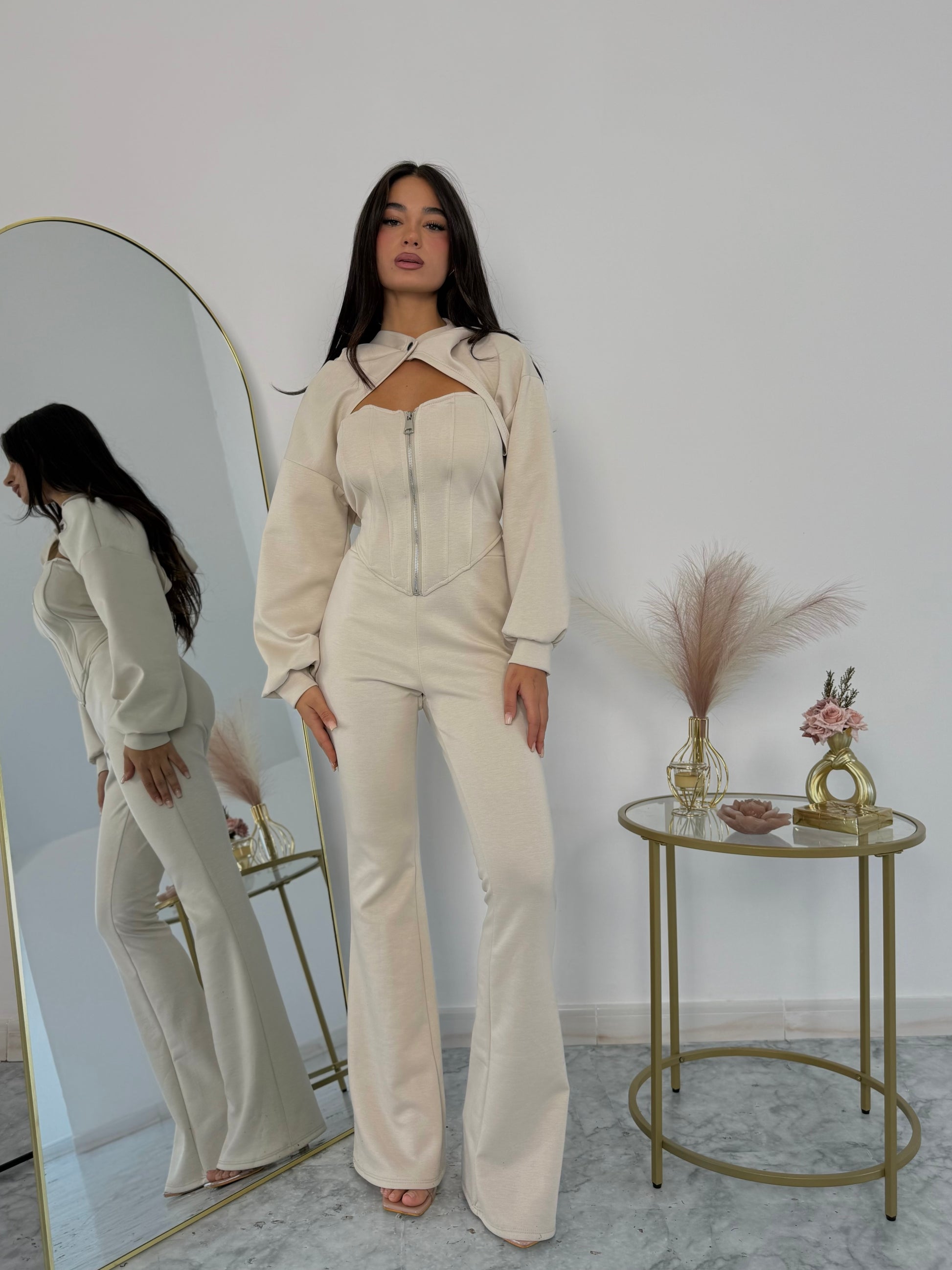 Completo tre pezzi con pantalone a zampa, corsetto e copri spalla, elastico.